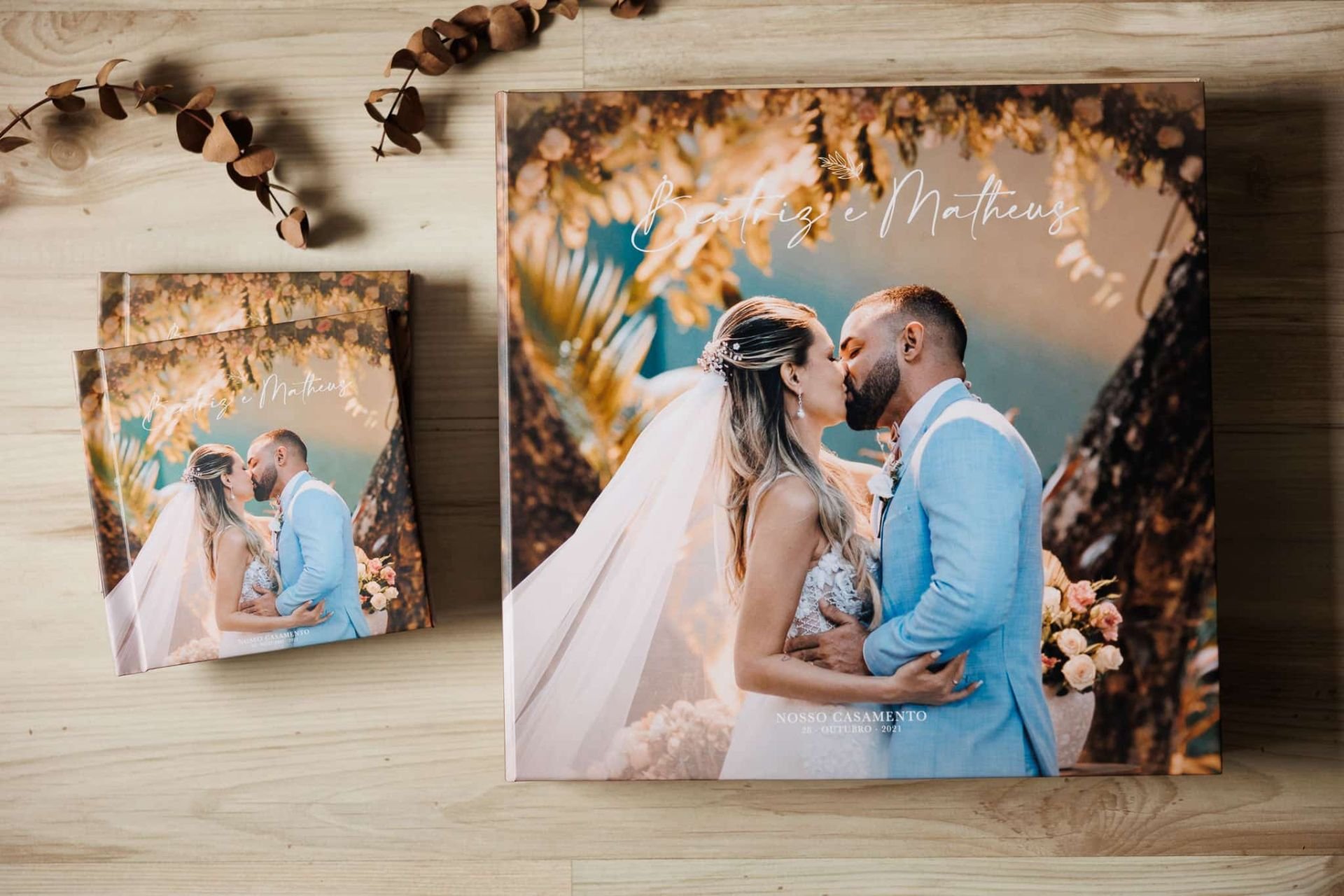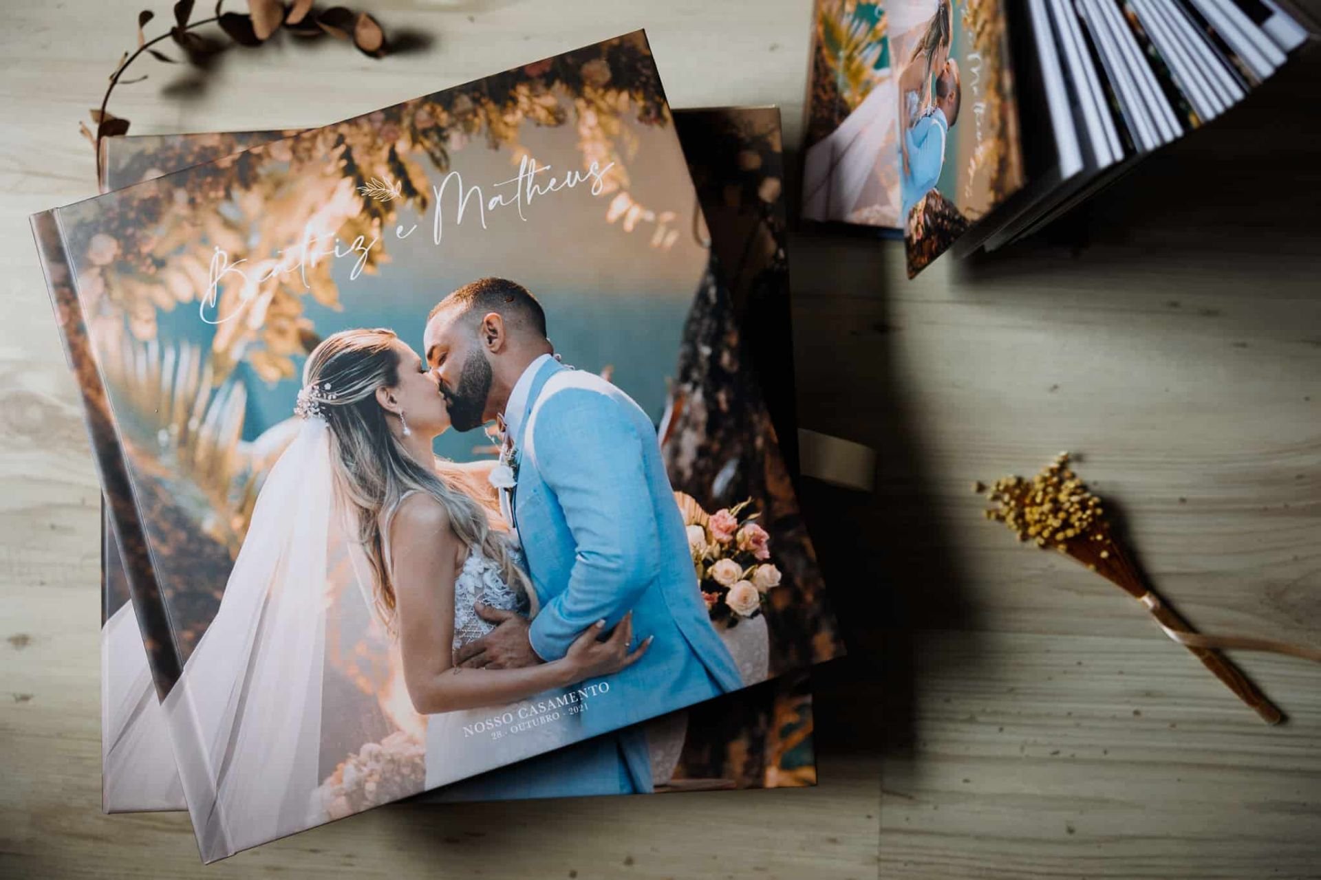 As fotos são suas. O álbum é um serviço de curadoria, design e impressão, independente de quem fotografou o casamento.